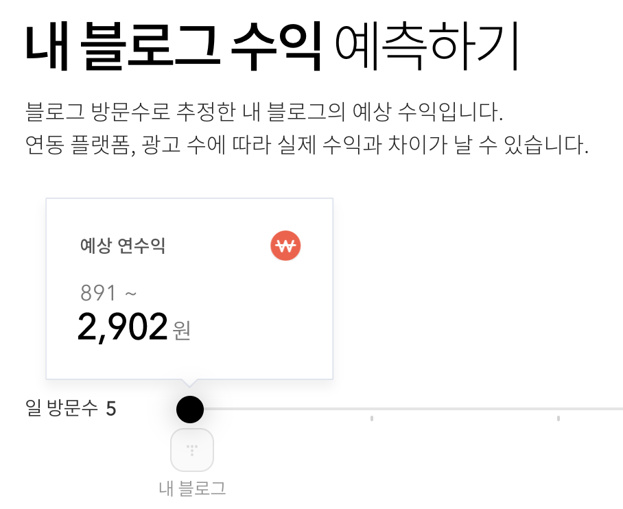 티스토리 블로그 일 방문 수를 통해 예상 수익을 예측할 수 있는데 예상 연수익이 891원~2,902원이다. 일 방문수가 2만 명 정도 되어야 예상 연수익이 대략 1200만 원, 월 100만이라고 한다.