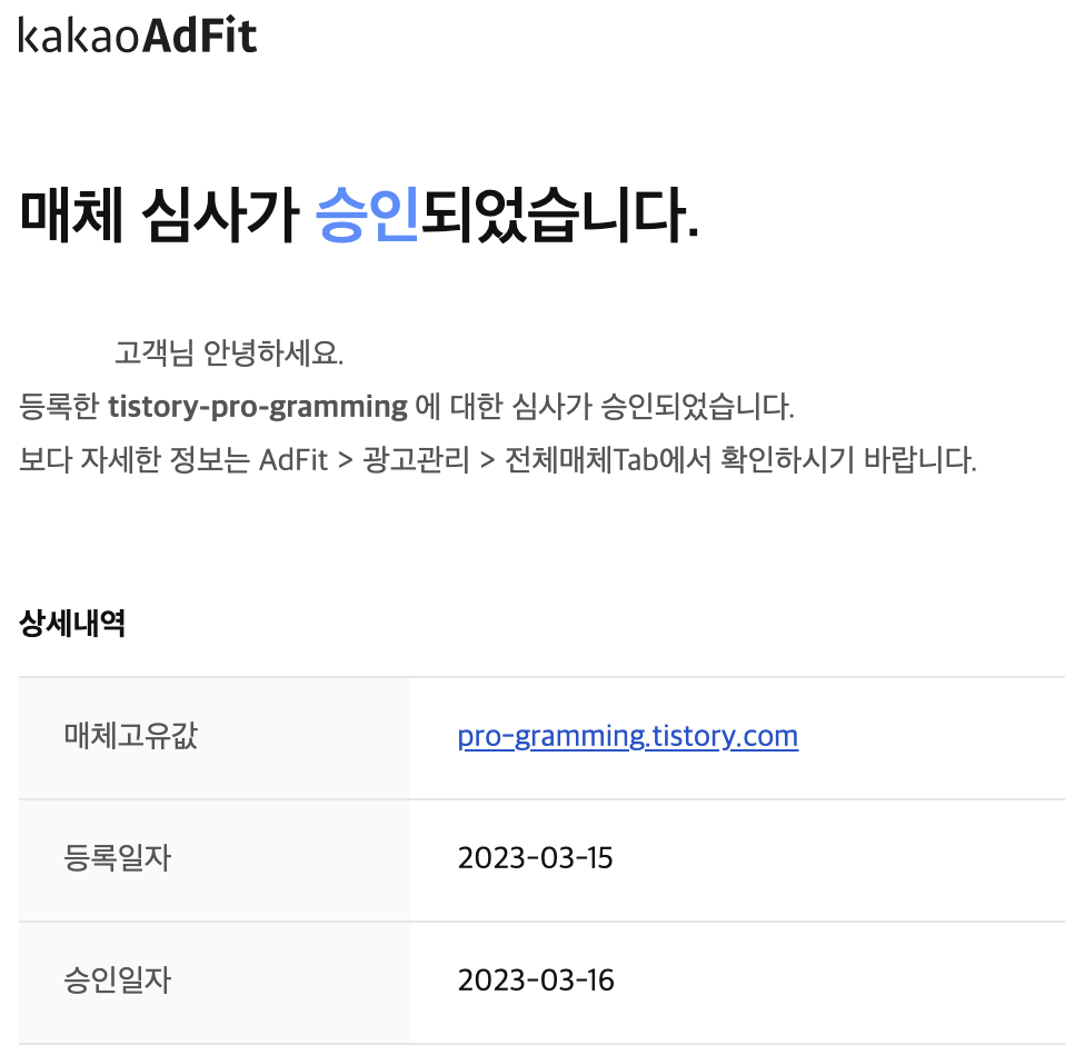 구글 애드센스를 승인을 기다리는데 카카오 애드핏 광고 연동을 신청하기 위한 조건을 만족하여 애드센스 승인을 기다리는 동안 카카오 애드핏 광고를 달아보자라는 생각에 15일 밤에 신청하였고 다음 날인 16일에 승인되었다고 메일을 통해 연락이 왔다.